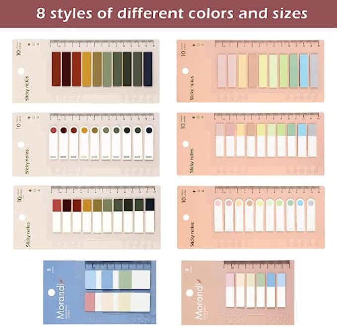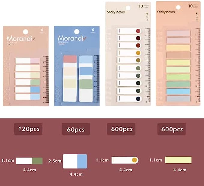 • [Package ]: Each pack come with 1200 pcs morandi color in 10 colors rectangle(4.4 x 1.2 cm) 120 pcs in 6 colors rectangle(4.4 x 1.2 cm)and 60 pcs in 6 colors rectangle(4.4 x 2.5cm) page markers , total 8 sets ,1380pcs.