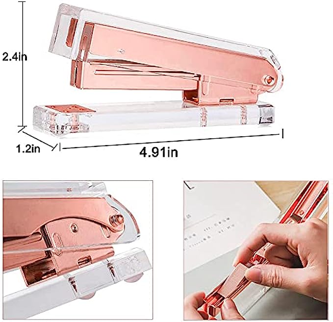 • 【WHAT YOU GET】When you buy this chic desk accessories gift set you will get one rose gold stapler, one tape dispenser, one staple remover, one tape and 1000pcs staples. These bling office supplies are decorative and yet professional. Perfect for the classroom, home, desk, or as executive office decor.