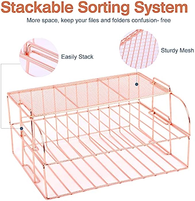 • ▶Aesthetic Design- Stylish rectangle shape with linear wire design, round edging along top rim prevents scratches. Smooth metal streamlines and rounded angles design protect your desktop from scratch. Stackable capabilities increase and utilize vertically-stored space to maximize your desktop workspace.