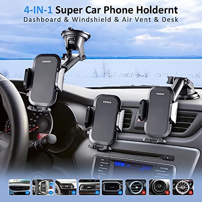 [Three-in-one phone holder for car] Our phone holder for car allows you to install it on the dashboard, windshield or vent without leaving any traces. This mobile phone holder provides you with a simple way to securely fix your mobile phone in place, and is ideal for cars, trucks, SUVs, etc. [Strong Adhesive Suction] The phone holder for car uses a powerful 3-layer viscous gel and a 1-step locking mechanism to provide strong suction on a smooth surface without leaving any residue. They will not fall off even when turning, bumping or driving at high speeds, and using TPU material can withstand temperatures from -4°F to 203°F. To restore the stickiness, simply rinse with warm water and dry.Please note, most likely will not work on leather/ vinyl dashboards. [Easy operation, strong compatibility] One-handed lightly touch, release or lock the phone within a few seconds-super convenient to use while driving. The SUUSON car phone holder mount has adjustable feet, stronger and wider clips, making this phone holder for car suitable for all (4.0"-7.0") mobile phone and mobile phone case combinations. [360°view angle available] 360° ball joint and extendable telescopic arm (4.43"-7.31") allow you to adjust the phone to any angle. This cell phone holder for car allows you to use your phone in portrait and landscape mode. Avoid obstructing the line of sight during driving to ensure driving stability and safety. [Perfect protection, best design] The car phone holder mount is covered with a thick layer of silica gel. The unprecedented design makes the mobile device zero scratches. The internal mechanical structure ensures that the arm holds the phone firmly. No need to worry that your phone will not fall off even on the most bumpy road. If you have any product problems or installation problems, please feel free to contact us, we promise to always provide satisfactory solutions and serve you.