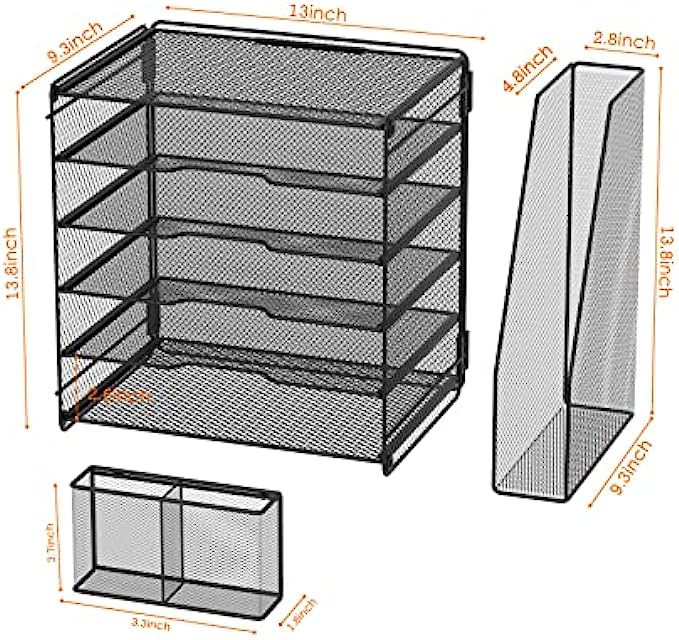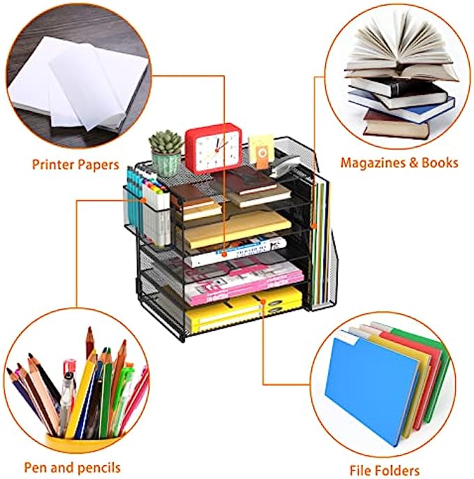 Multiple Use Desk Organizer: Can hold all your printer paper, documents, file folders, mail forms and other paper letters. Extra vertical file sorters can stand your books and magazines,pen holders can storage your other desk accessories, all-in-one desk organizer.